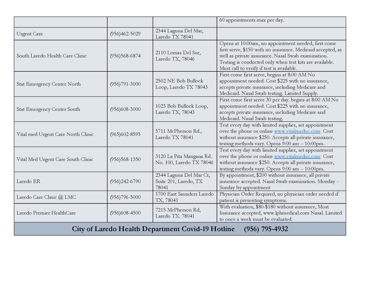 City Of Laredo On Twitter Below Is A List Of Locations That Offer Covid 19 Testing In Laredo As 7 9 Each Clinic Has Allocated Supply Of Test And Are Subject To Change Https T Co Kwdjm37lpr